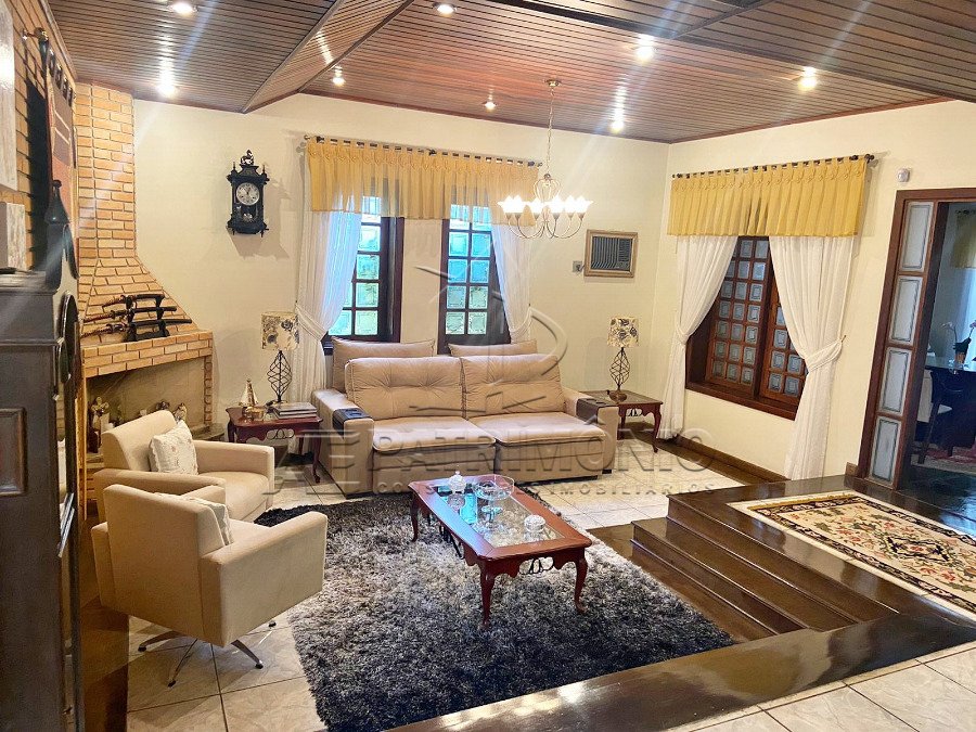 Sobrado com sala 2 ambientes com lareira, sala de jantar, sala de TV, lavabo, 4 dormitórios sendo 1 máster com closet grande e banheira, outra suíte completa e 2 dormitórios com banheiro compartilhado, escritório, copa/cozinha com armários, despensa, área de serviço, dormitório da empregada com suíte, espaço gourmet com churrasqueira, quintal com pomar e 4 vagas de garagem coberta.