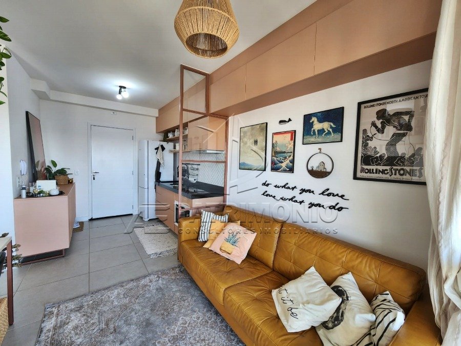 Apartamento loft com sala de estar, cozinha, lavanderia, banheiro social, 1 dormitório, varanda e 1 vaga de garagem coberta.